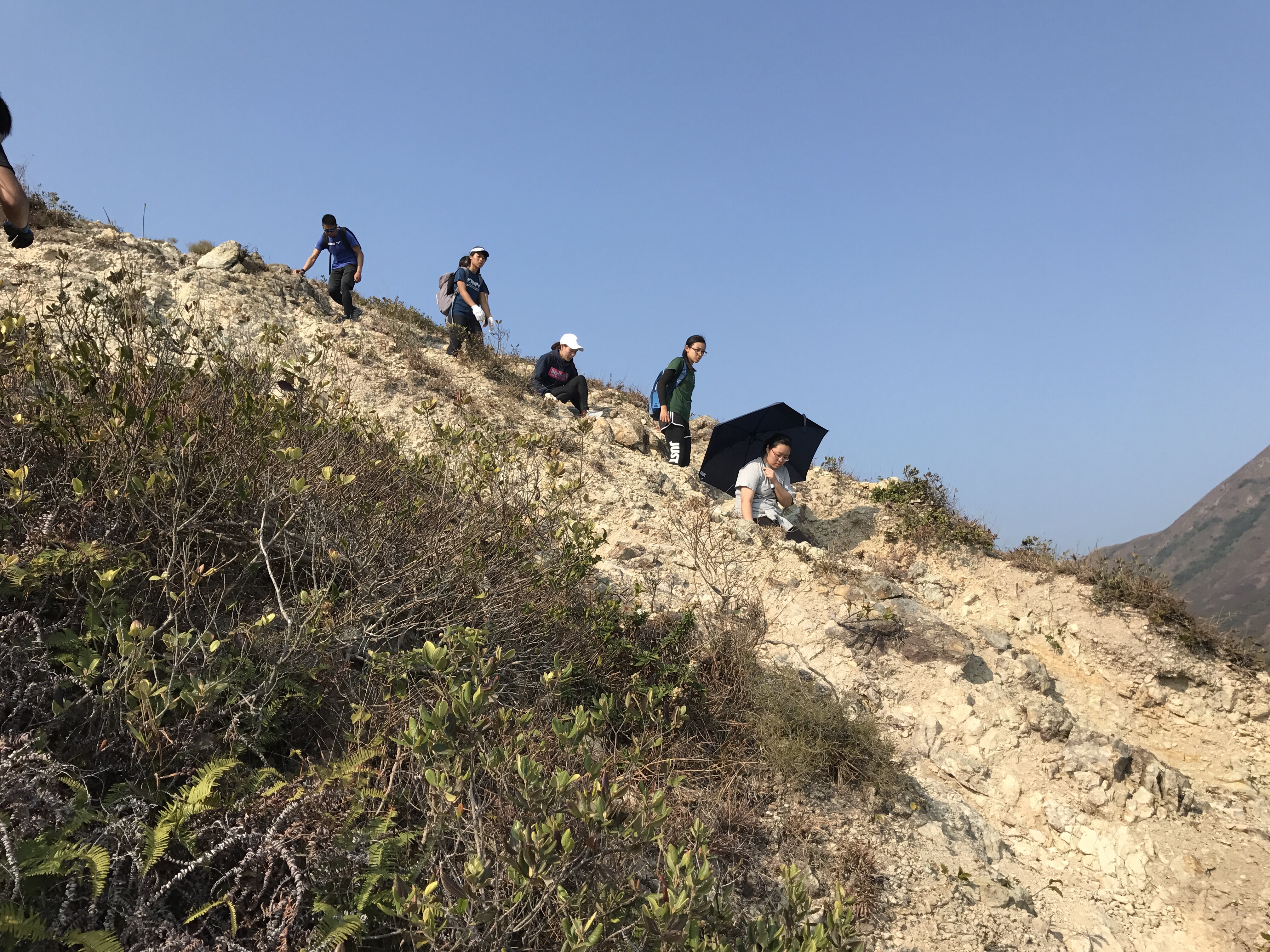開始上斜,路徑十分陡峭及因風化而產生很多浮沙碎石,需手足並用慢慢地攀上,我們行得十分平穩,沒有滑到,但都好不容易才來到較平坦的山脊處。