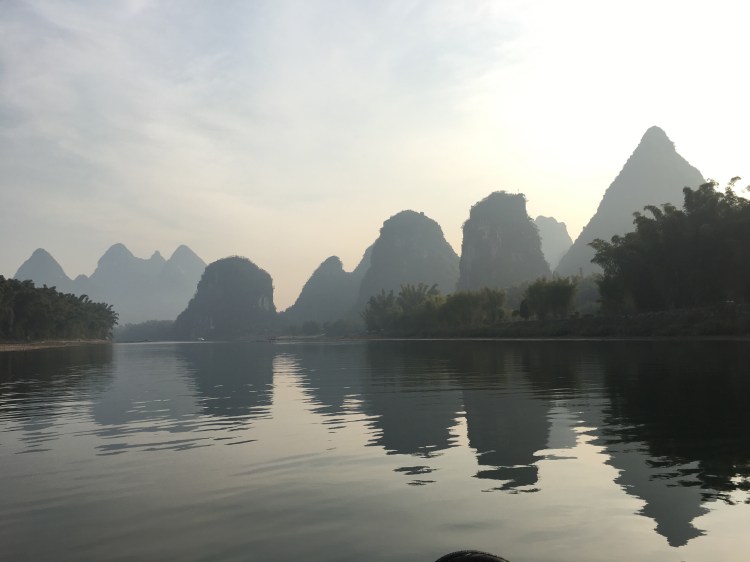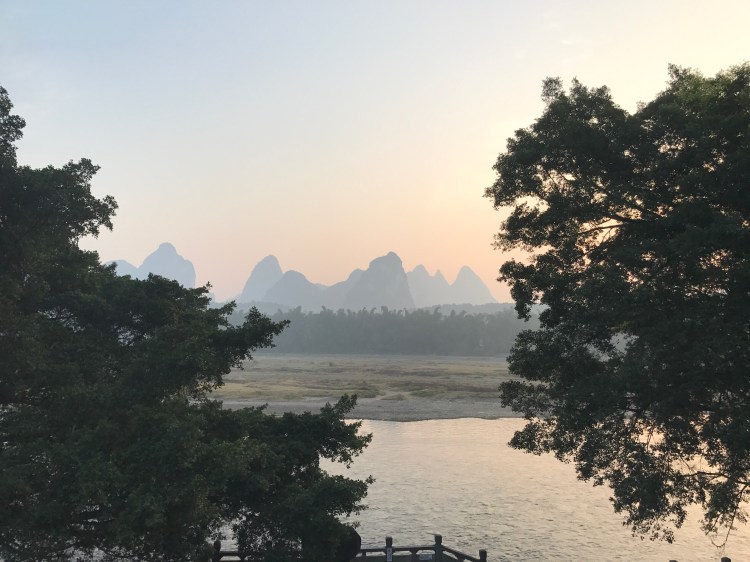 早上6點半起床,我們在客棧附近買了小龍包,邊走邊吃,去陽朔漓江河看日出,日出時間約7:15。