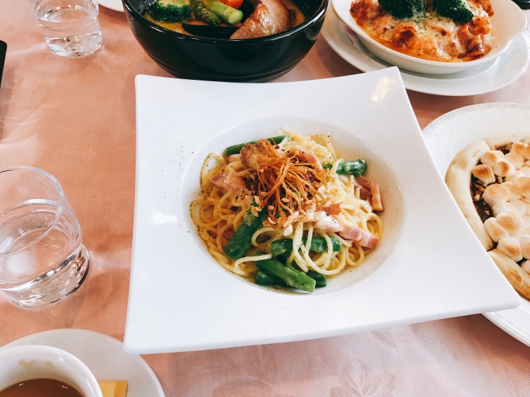在門口拍完照後,先去「白色戀人餐廳」品嚐了湯咖喱,朱古力薄餅,卡邦尼意粉,芝士焗西蘭花,白之戀人咖啡。