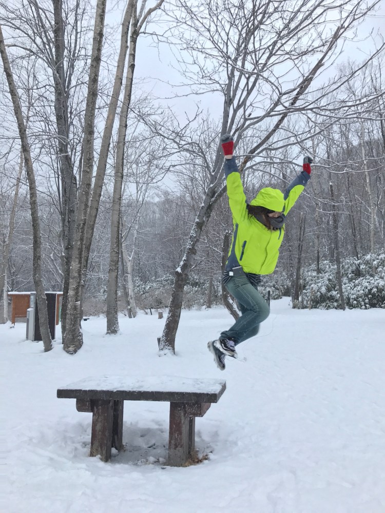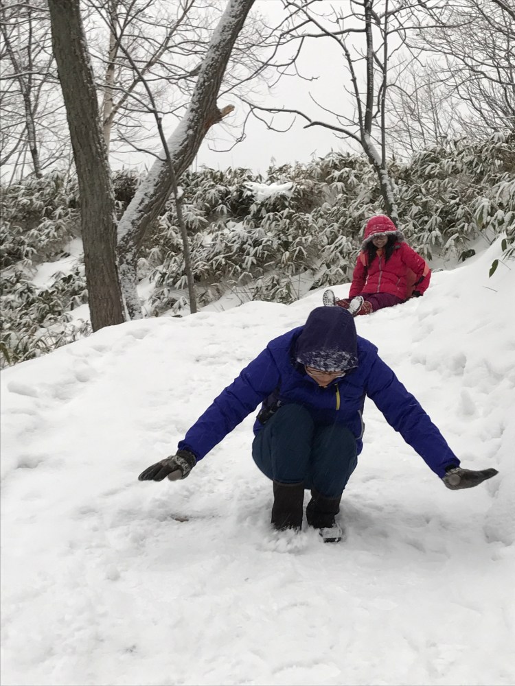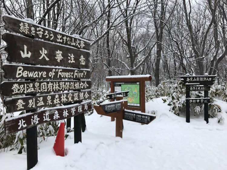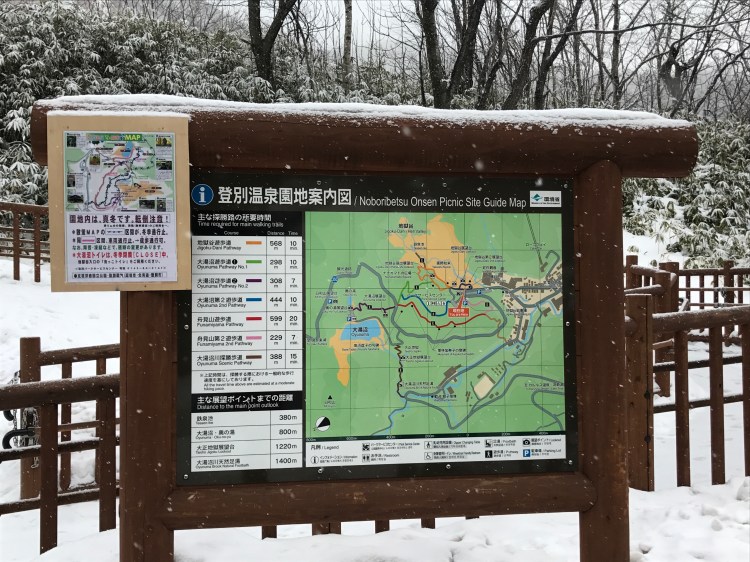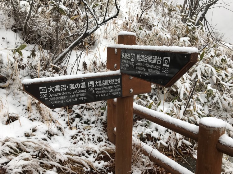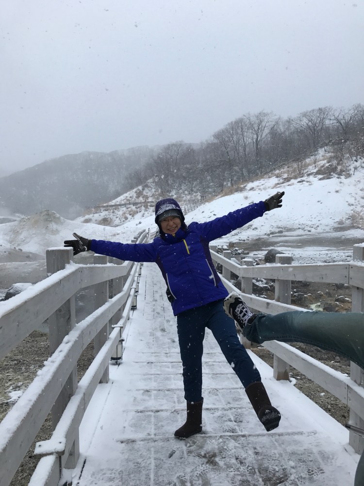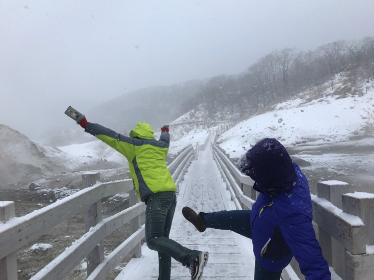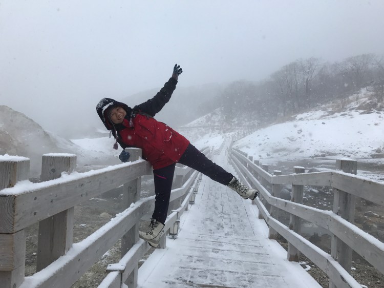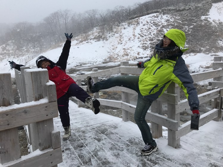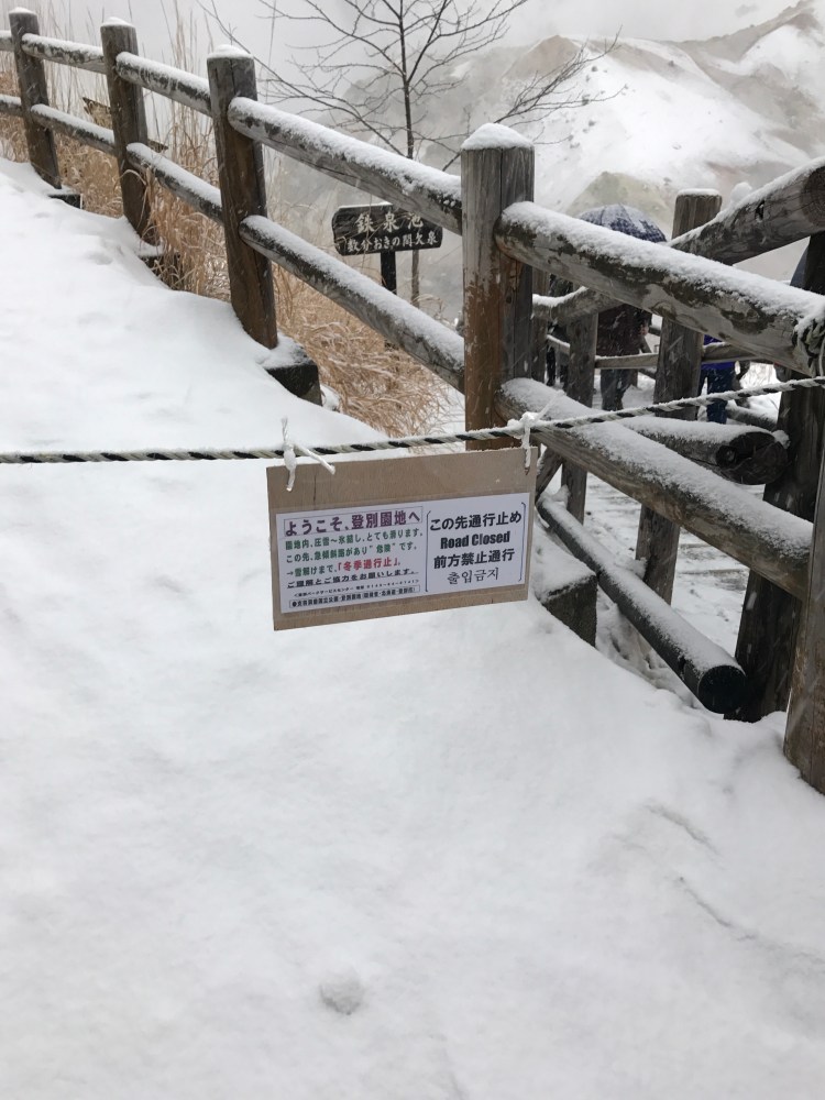 原路返回入口處,徙步去「大湯沼」。很多主要通住「大湯沼 – 天然足浴」的路都封了,我們只能走車路去。冬天走這條路是一種挑戰,路不好走,有些路走不到,就滑下去。來這邊幾乎沒有遊客,一路沿著溪流走過去才到目的地,抵達的時候沒有人泡湯,路面結冰濕滑,我們都放棄泡腳🤭🤭🤭🤭