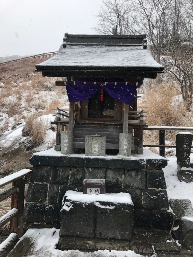 從「地獄谷」入口步行15分鐘就到「藥師如來堂」,再步行10分鐘到達「鉄泉池」。正在下大雪,地面很滑,步步為營。在这條路跑步唔夠30秒就仆街了…