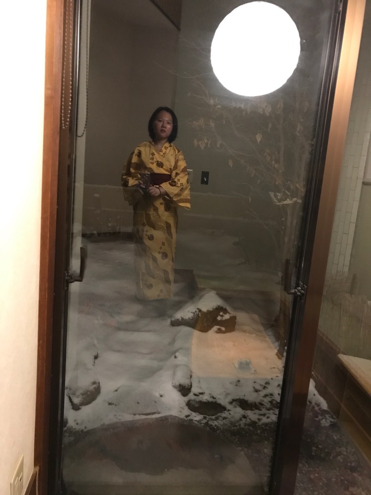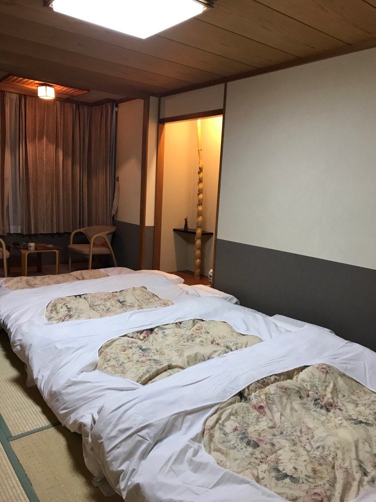 大約晚上10點多回到旅館,一打開門 ~ 有驚喜呀🤩🤩🤩職員把我們的床墊都舖好~我們就換浴袍去泡溫泉♨️。(這款束腰浴袍真的不好穿,一邊穿一邊掉下來,穿了很久,而且束腰有點不自在)