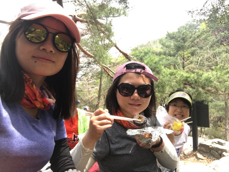 好多韓國人都買「紫菜包飯」帶上山吃,我們也買了,還送泡菜和酸蘿蔔😋😋😋都是我們最愛😍😍