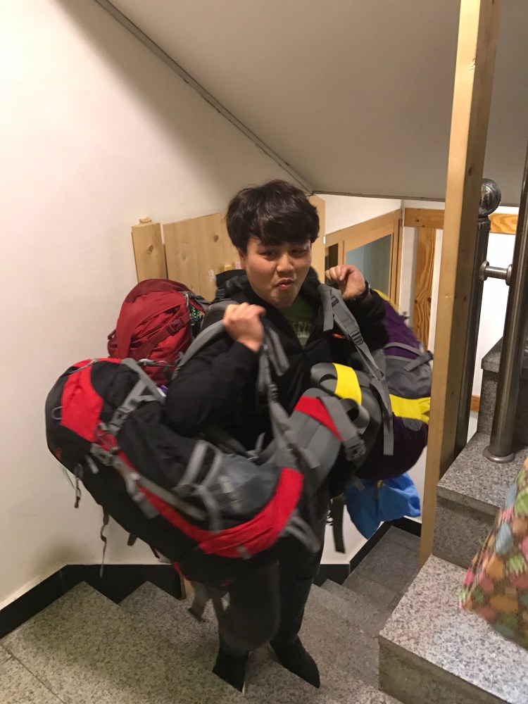 Oppa 見到我們帶背包都很驚訝🙀😱所以他要挑戰四個背包一齊幫我們拿上房~~~真是謝謝他啦!😉😉😉