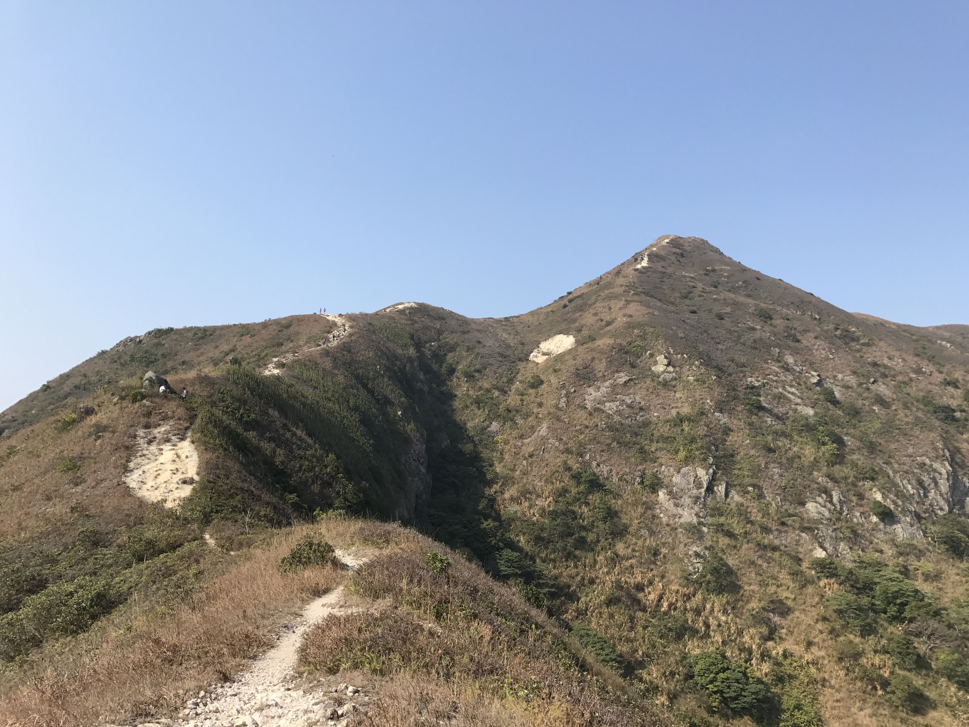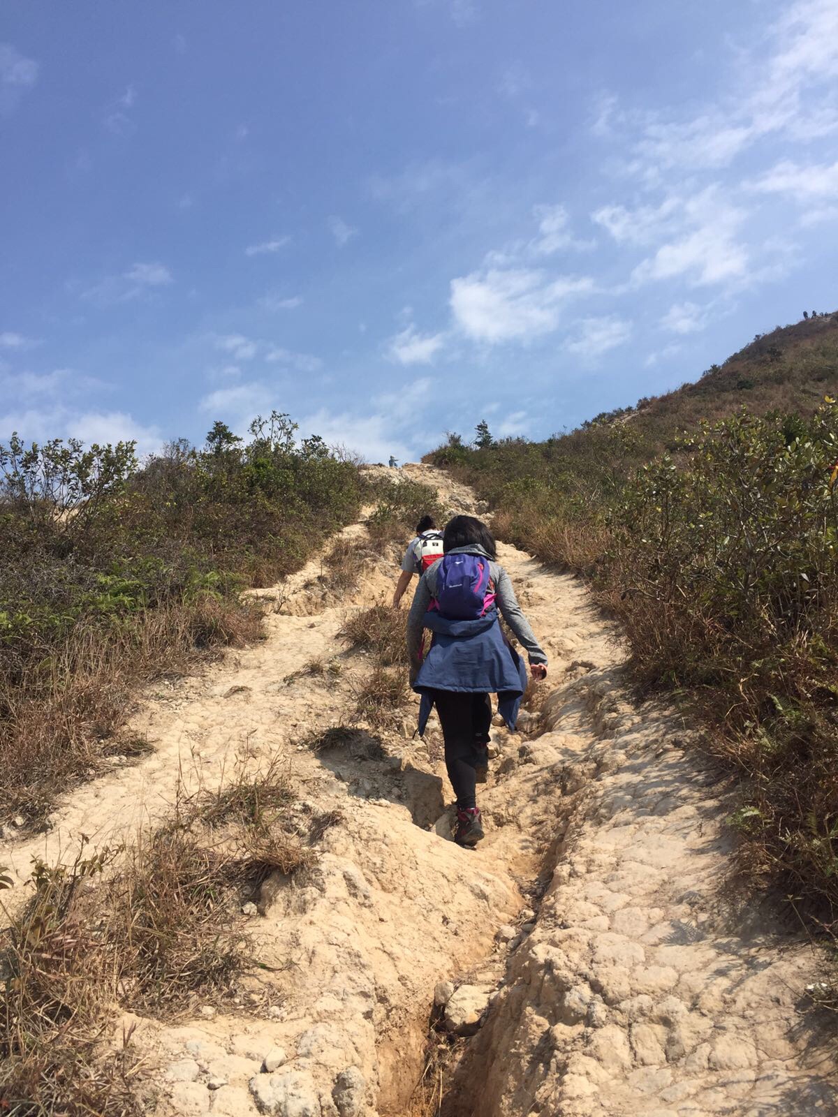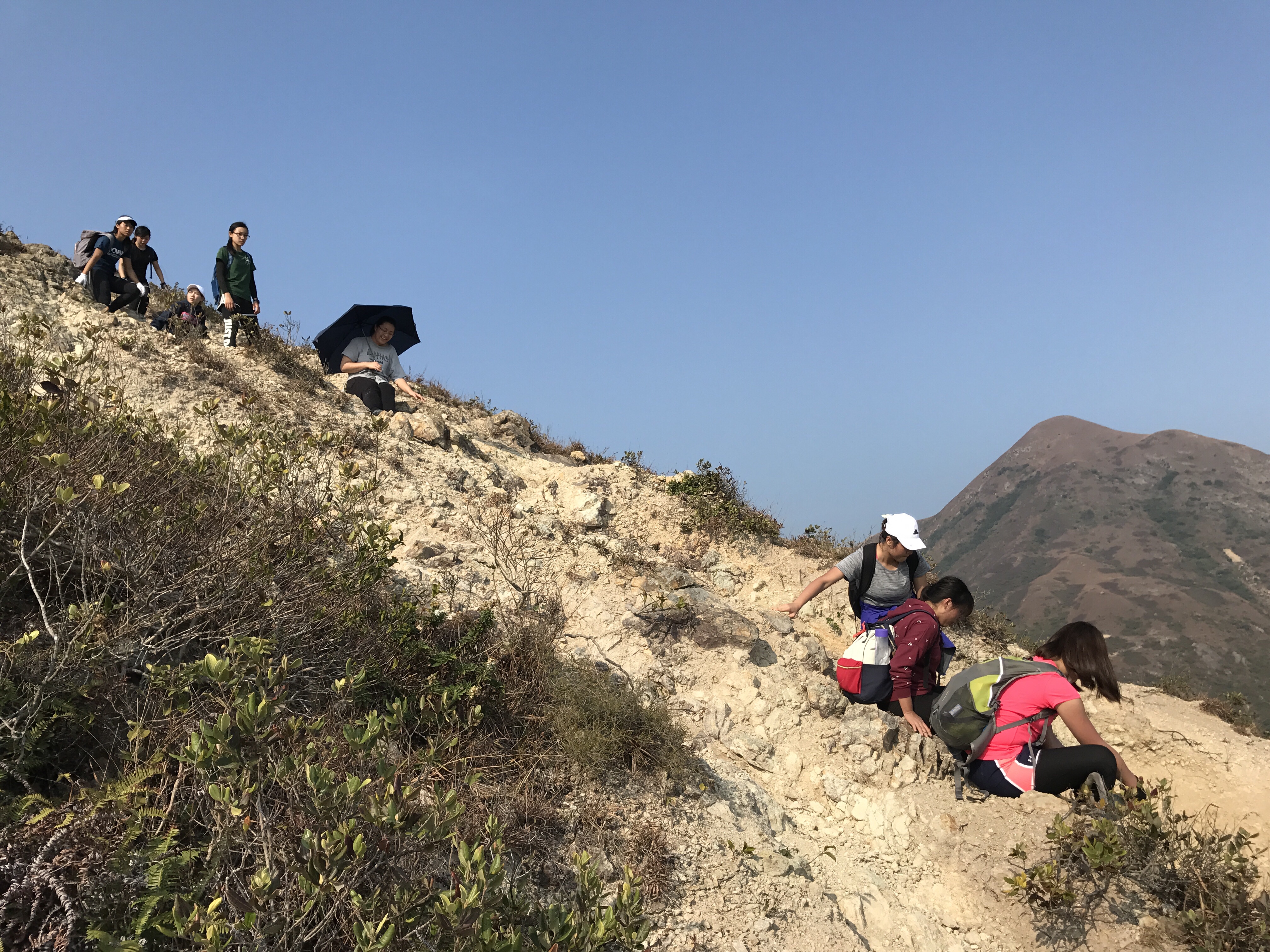 開始上斜,路徑十分陡峭及因風化而產生很多浮沙碎石,需手足並用慢慢地攀上,我們行得十分平穩,沒有滑到,但都好不容易才來到較平坦的山脊處。