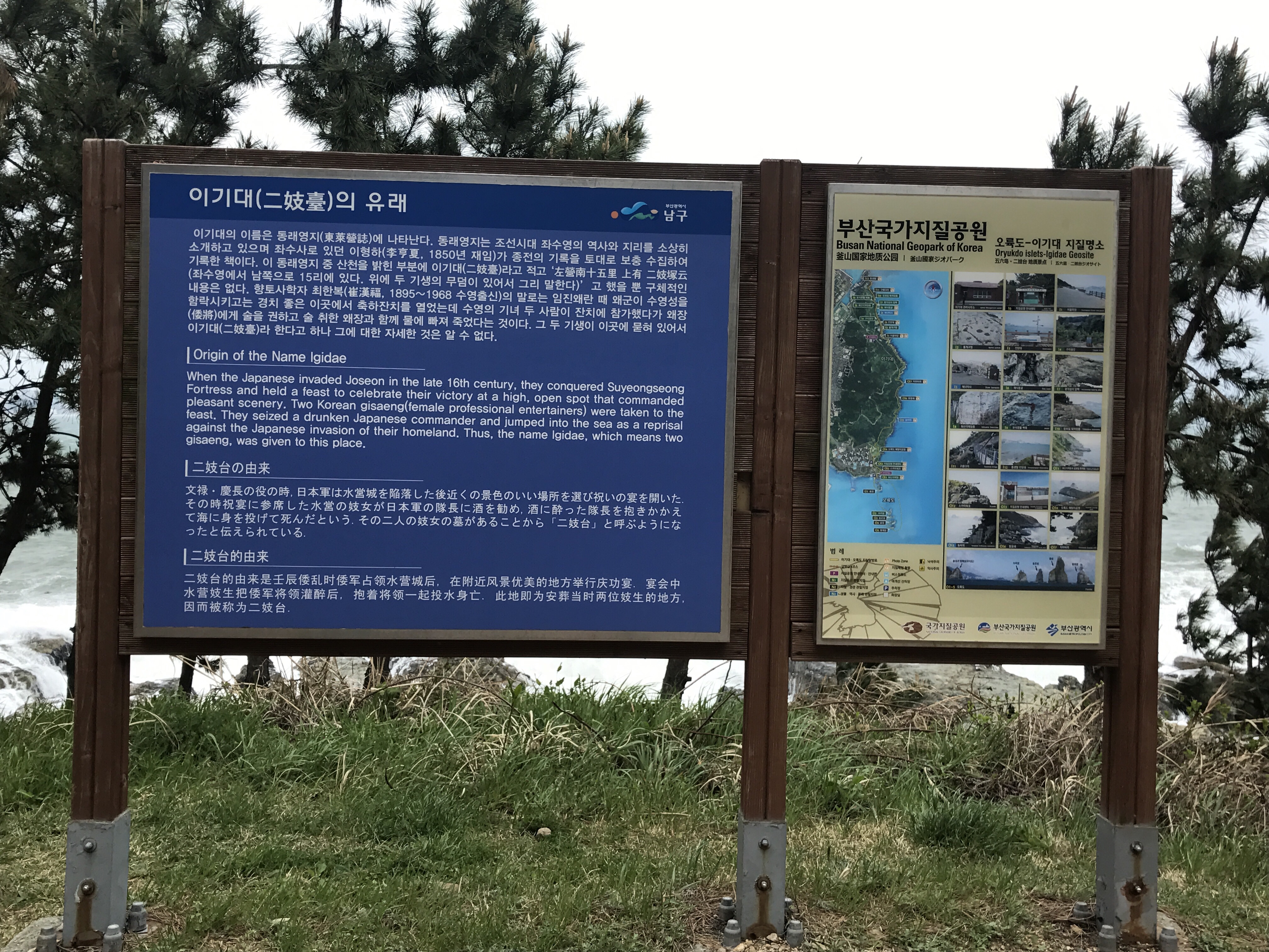 💥🙆🏻♀️🙆🏻♀️關於二妓台的故事,據說是朝鮮時代王辰倭亂(1592-1598年)時,日軍在釜山登陸,攻下水營,在此地慶祝,並招了兩個「妓生」伴舞。兩位妓生把倭軍將領灌醉後,抱住將領一起投水身亡。此地即為安葬當時兩位妓生的地方,因而被成為「二妓台」。
