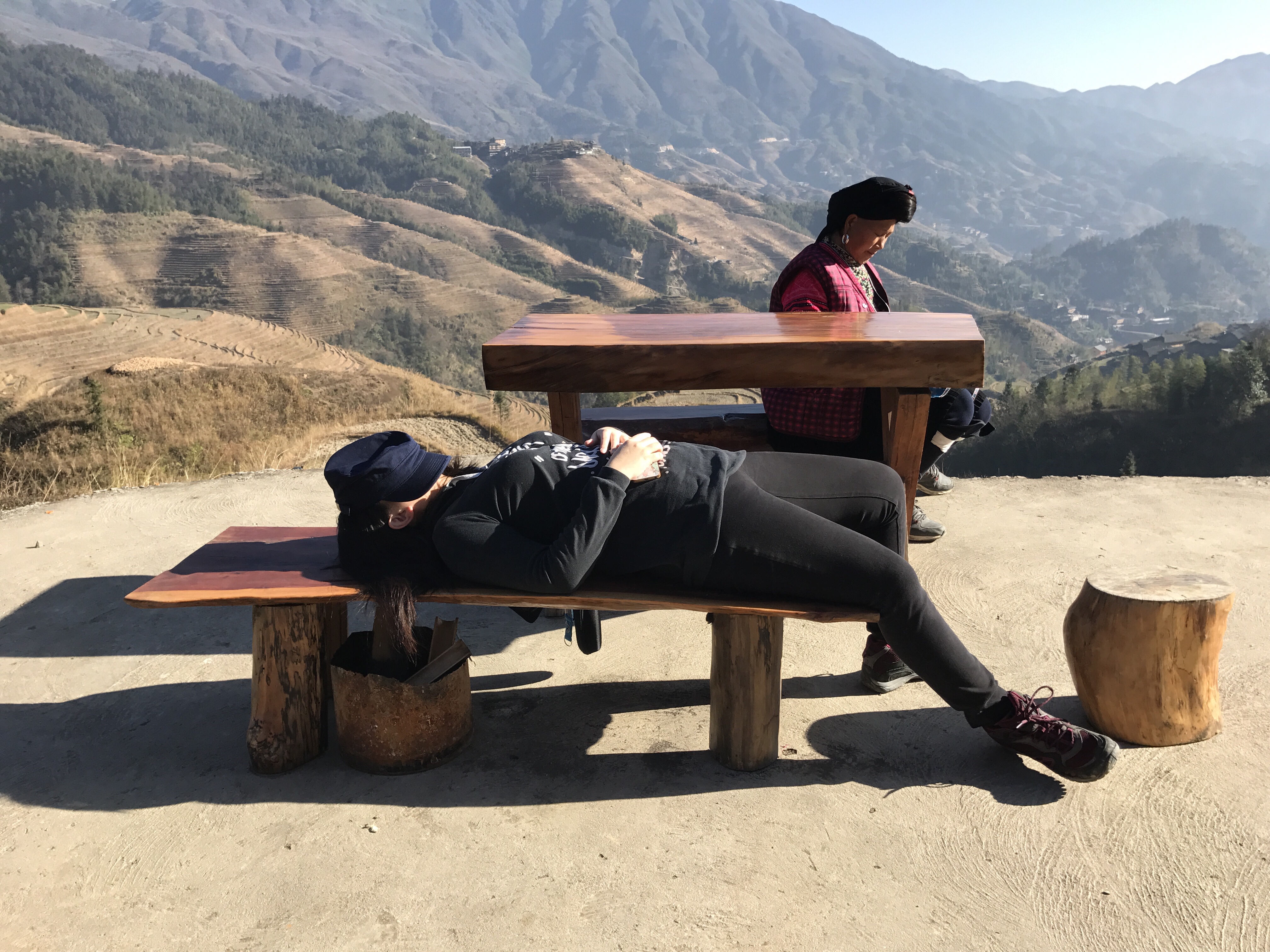 見到有椅子,立刻停下休息,等同伴🙃🙃