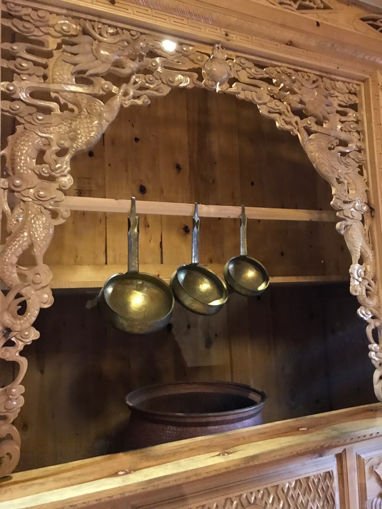 大昭寺-最上面是法輪和左右兩隻鹿,也稱作「法輪雙鹿」,因為佛陀在鹿野苑講經,所以是象徵著佛陀常轉法輪,弟子聞法。第二層是平安結,也就是是中國結。最下層是兩個「鼎」。