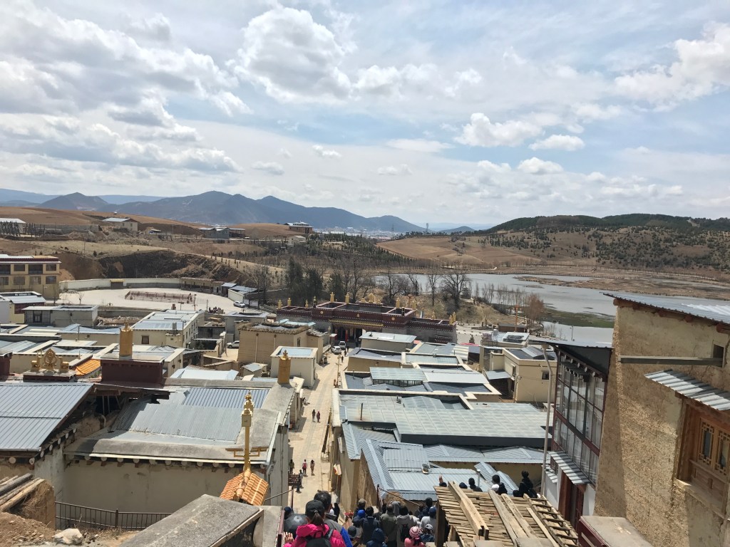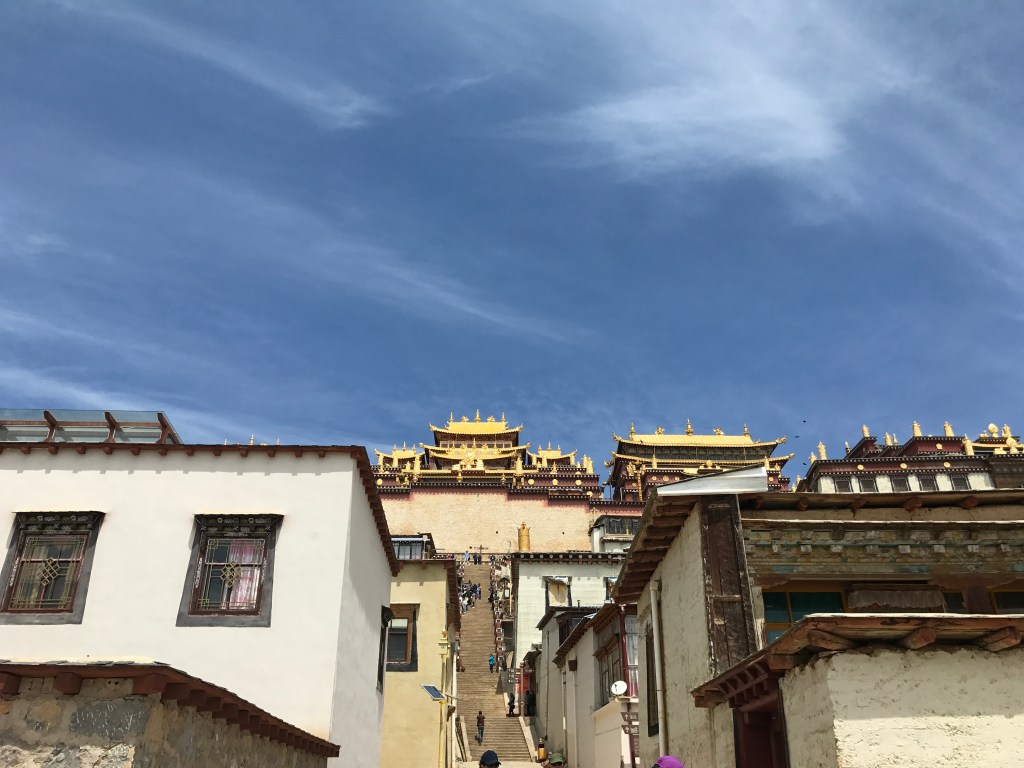 由下往上看,有三座主要的大殿,中間最高的是札倉大殿,主要是僧侶學習及研究經典及教義的地方,左邊的是宗喀巴大殿,右邊的是釋迦牟尼大殿。三座大殿都是傳統的藏式建築,屋頂上也都有金光閃閃的轉經輪,由左至右也分別代表著佛法僧。